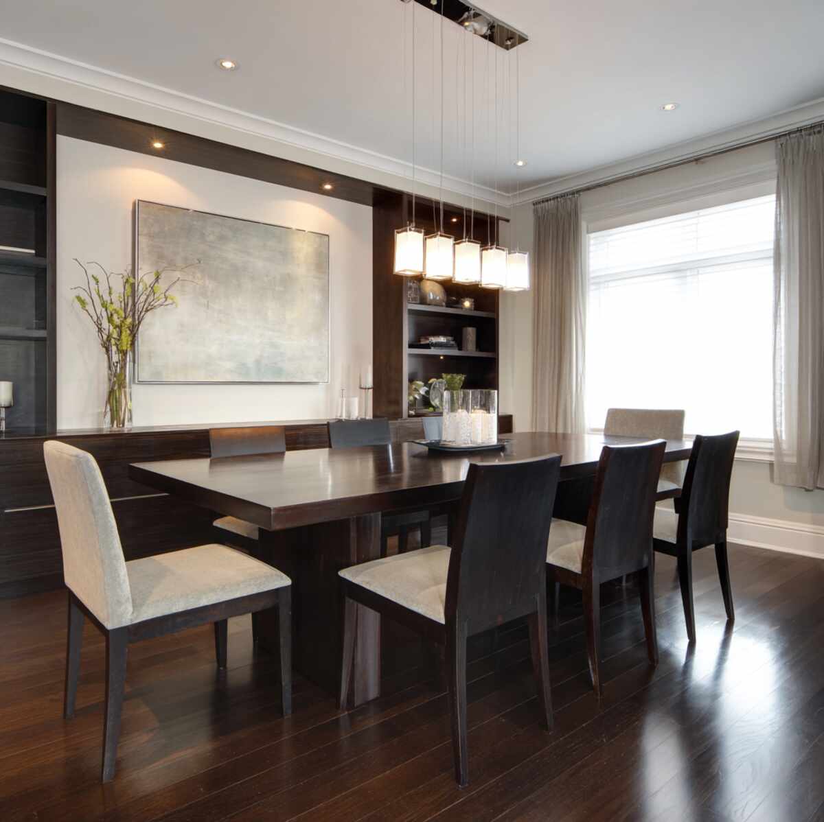 A sleek rectangular dark wood table is a modern staple. Its straight lines keep the room looking clean and structured.