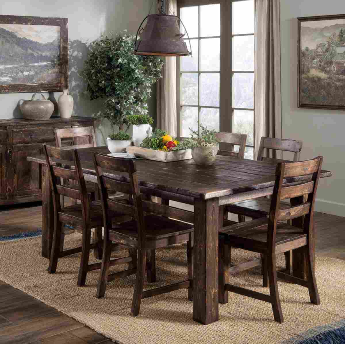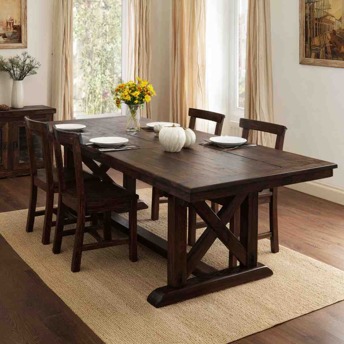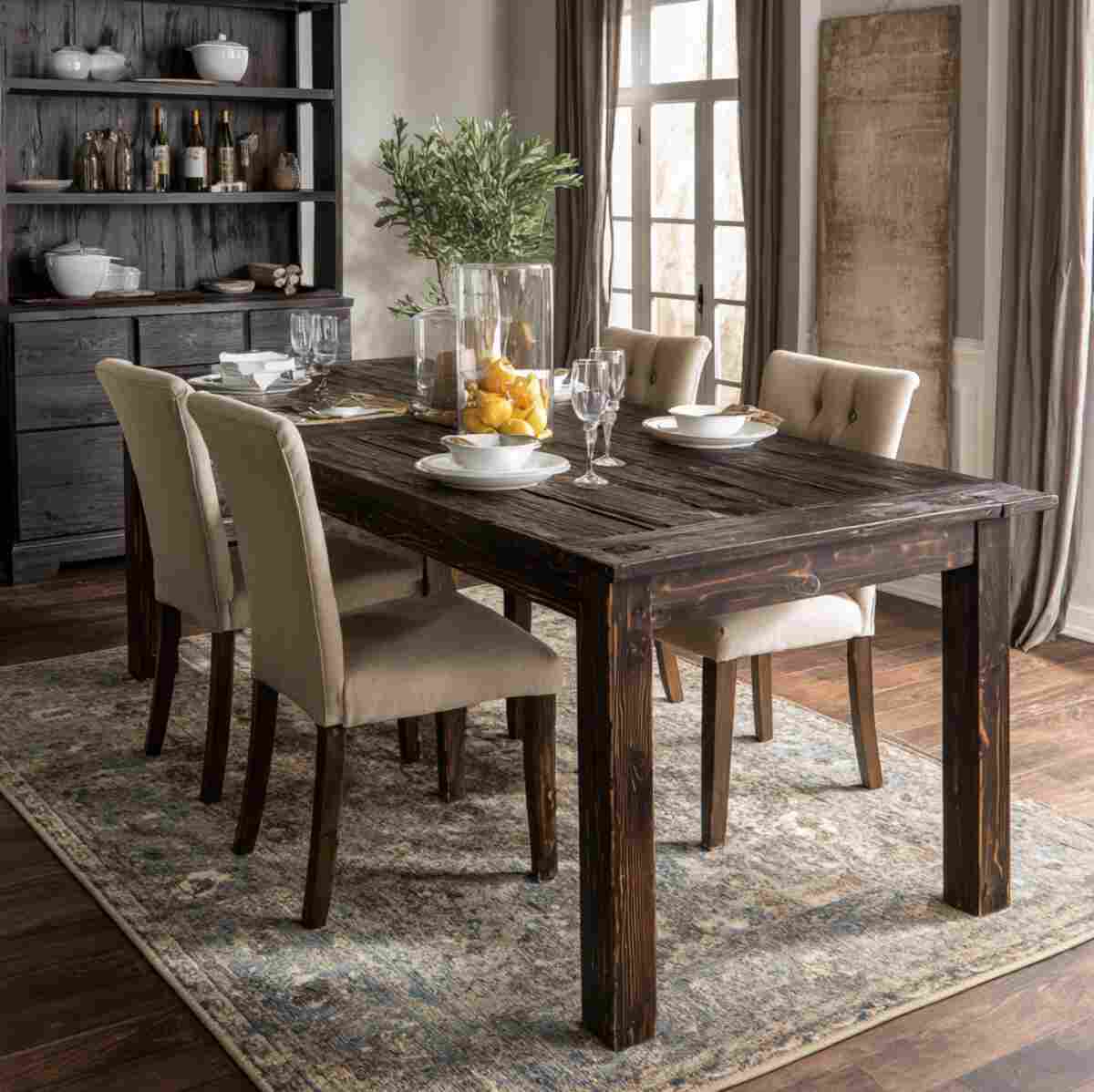 A rustic farmhouse dining set in dark wood brings cozy character to the dining area. The distressed finish highlights natural grain patterns that add charm and authenticity.