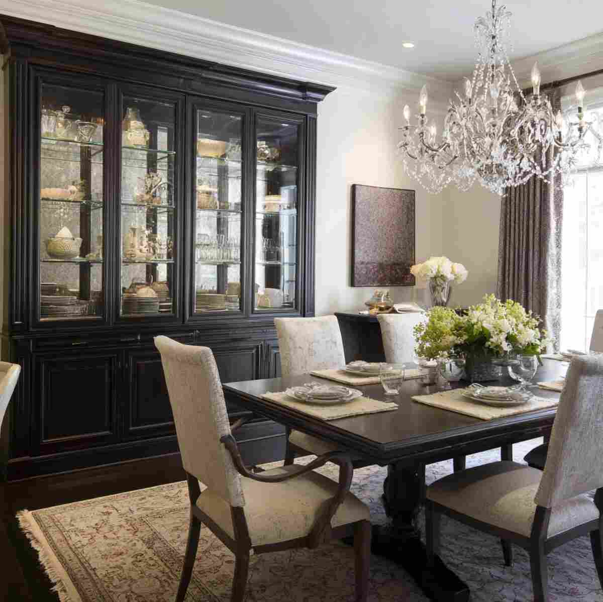 A glass-front china cabinet in dark wood instantly elevates the dining space. It provides both storage and a display area for treasured dishware.