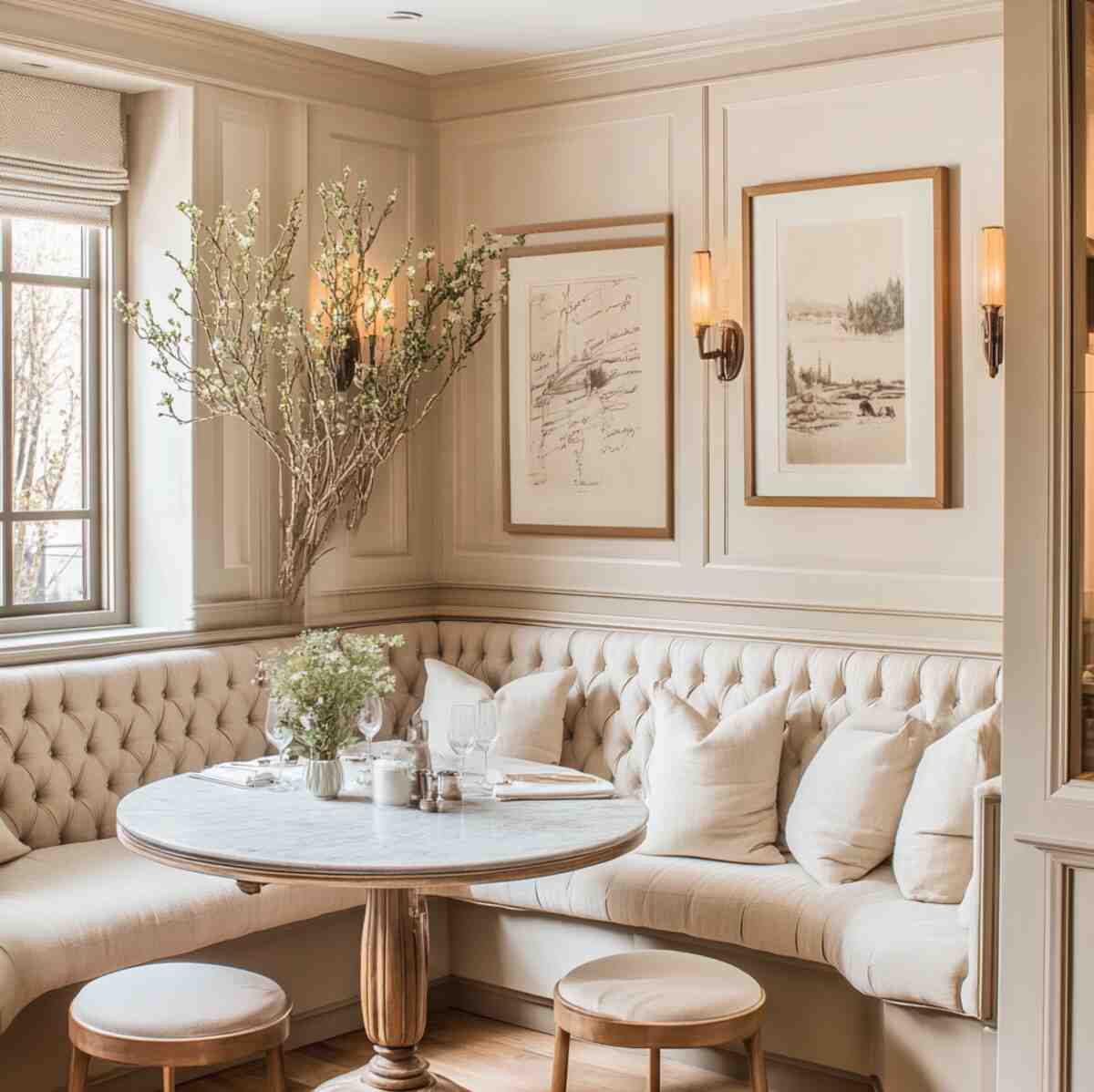 A bistro-inspired booth gives your dining area a casual, friendly feel, making it an uplifting choice for Cozy Dining Booth Seating Ideas.