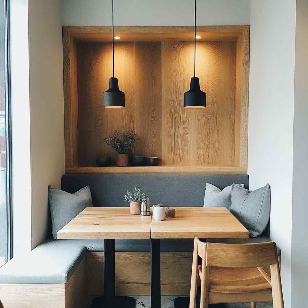 A Scandinavian booth uses light wood and simple design elements to bring peace and warmth into Cozy Dining Booth Seating Ideas.