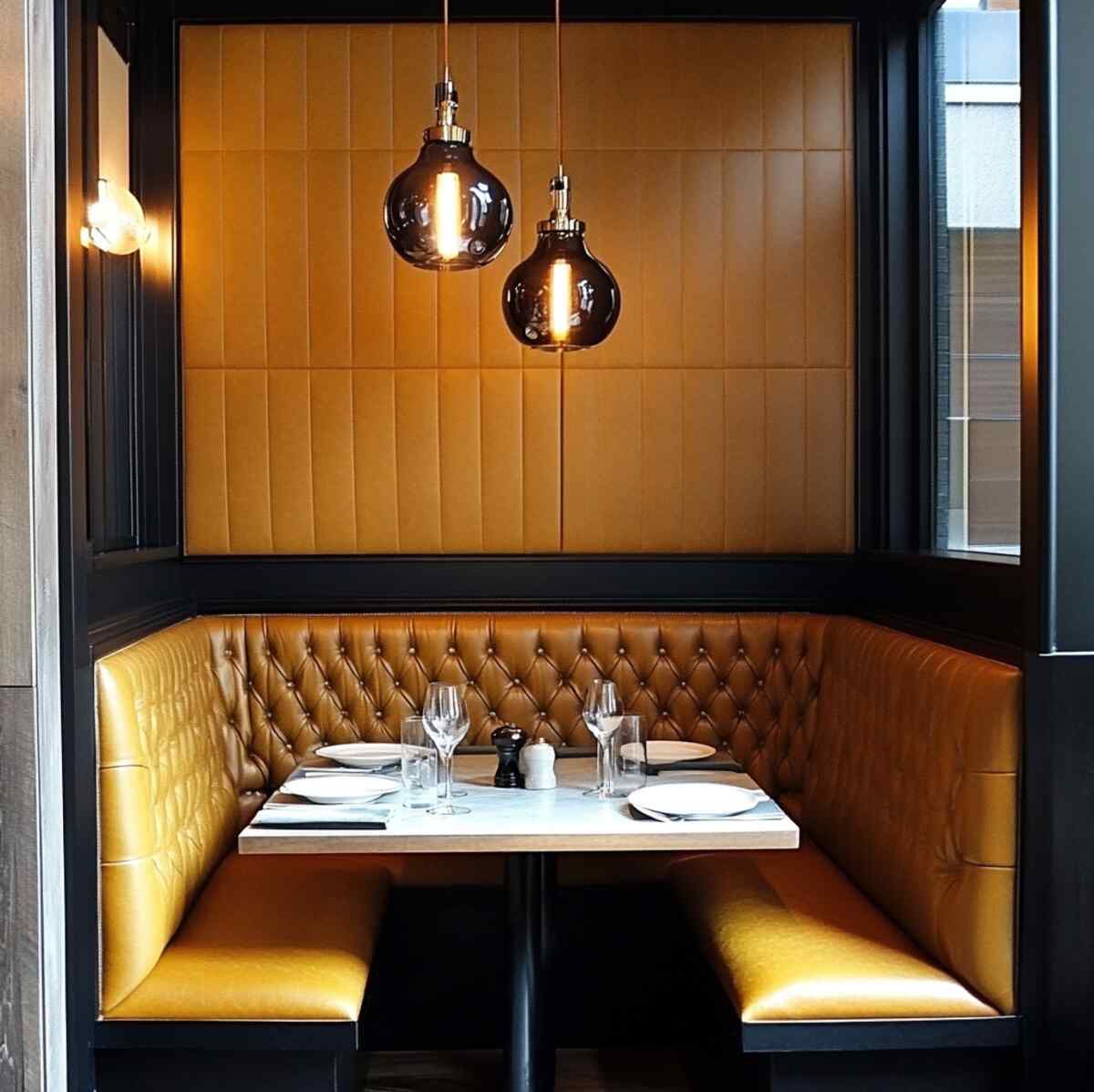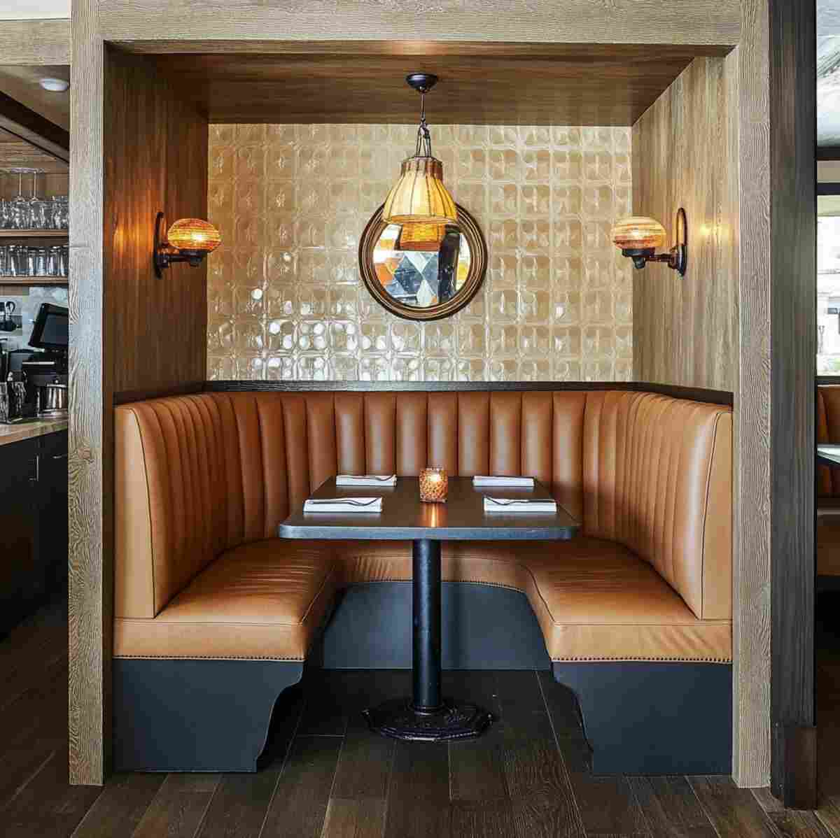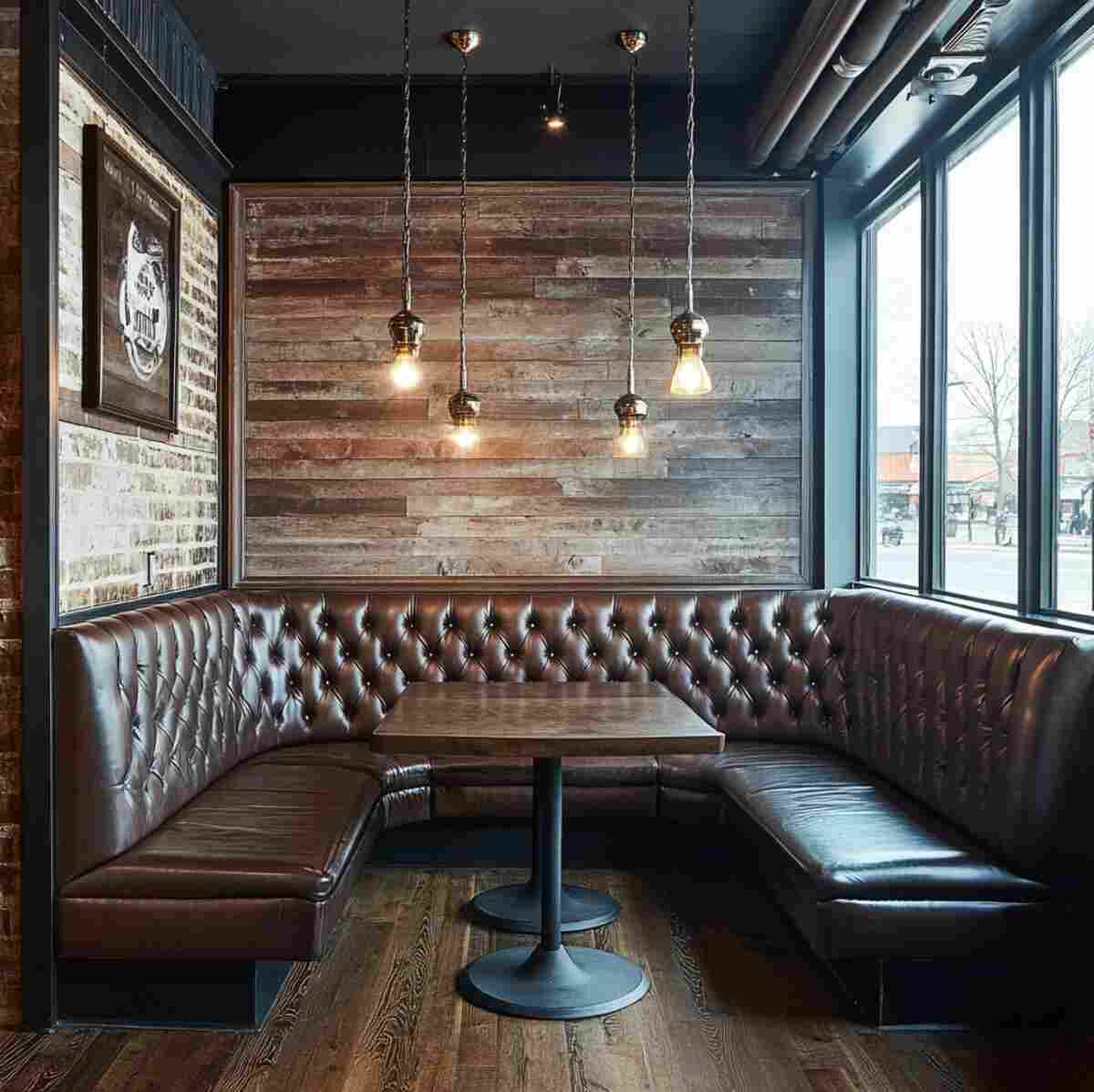 A leather café-style booth delivers durability and comfort, making it a timeless option for Cozy Dining Booth Seating Ideas.