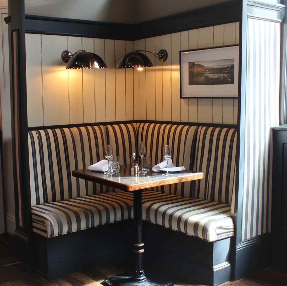 A two-tone cushion booth brings personality and style to Cozy Dining Booth Seating Ideas.