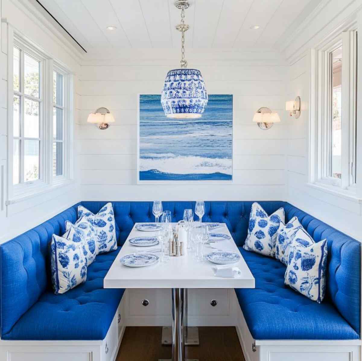 A coastal white-and-blue booth brings a breezy, calming touch to Cozy Dining Booth Seating Ideas.