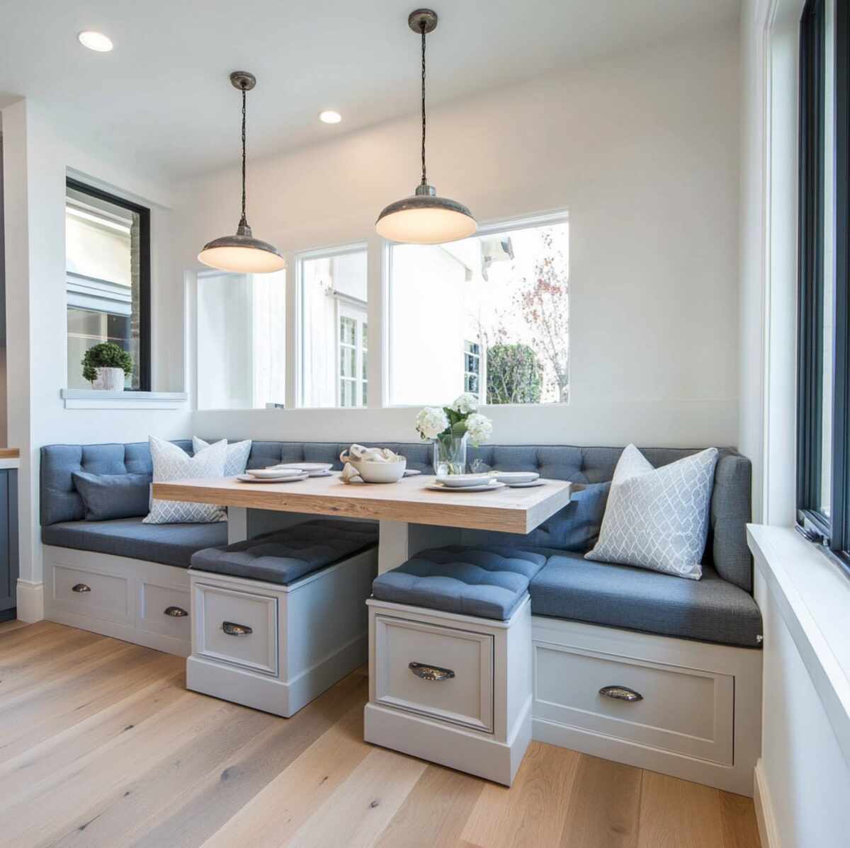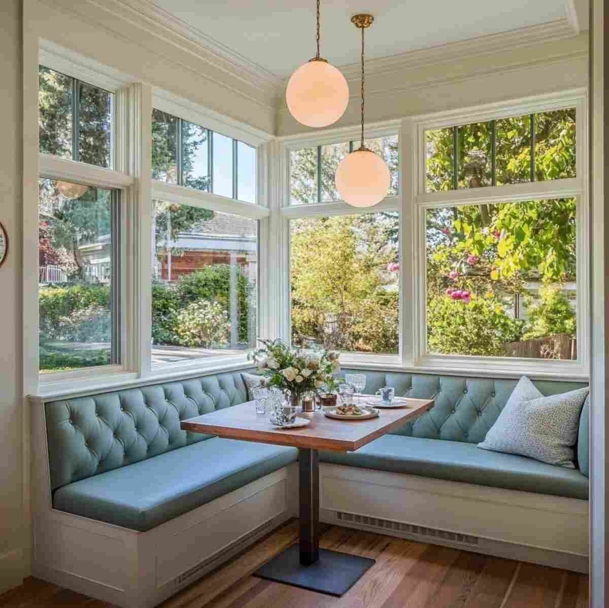 A window-side breakfast nook is one of the most charming Cozy Dining Booth Seating Ideas because it makes mornings feel bright and relaxing. The natural light adds warmth and comfort to the space.
