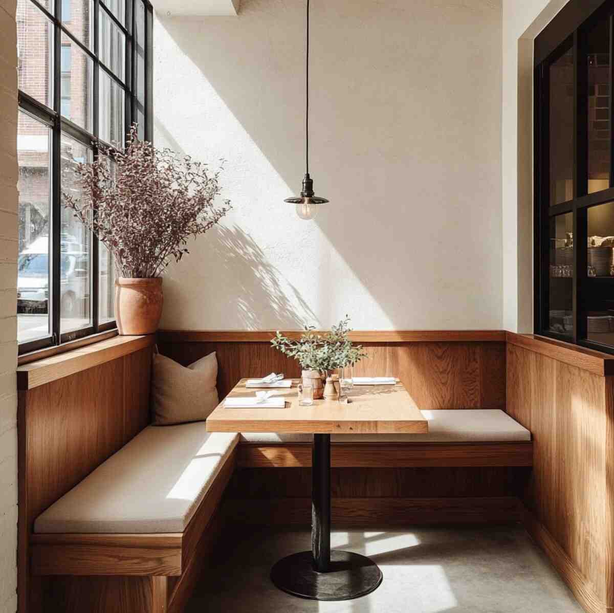 A built-in wooden bench booth brings a classic charm that fits perfectly into many Cozy Dining Booth Seating Ideas.