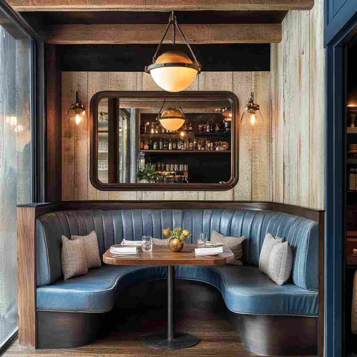 An upholstered corner booth is one of the most popular Cozy Dining Booth Seating Ideas because it adds softness and comfort to tight dining spaces.