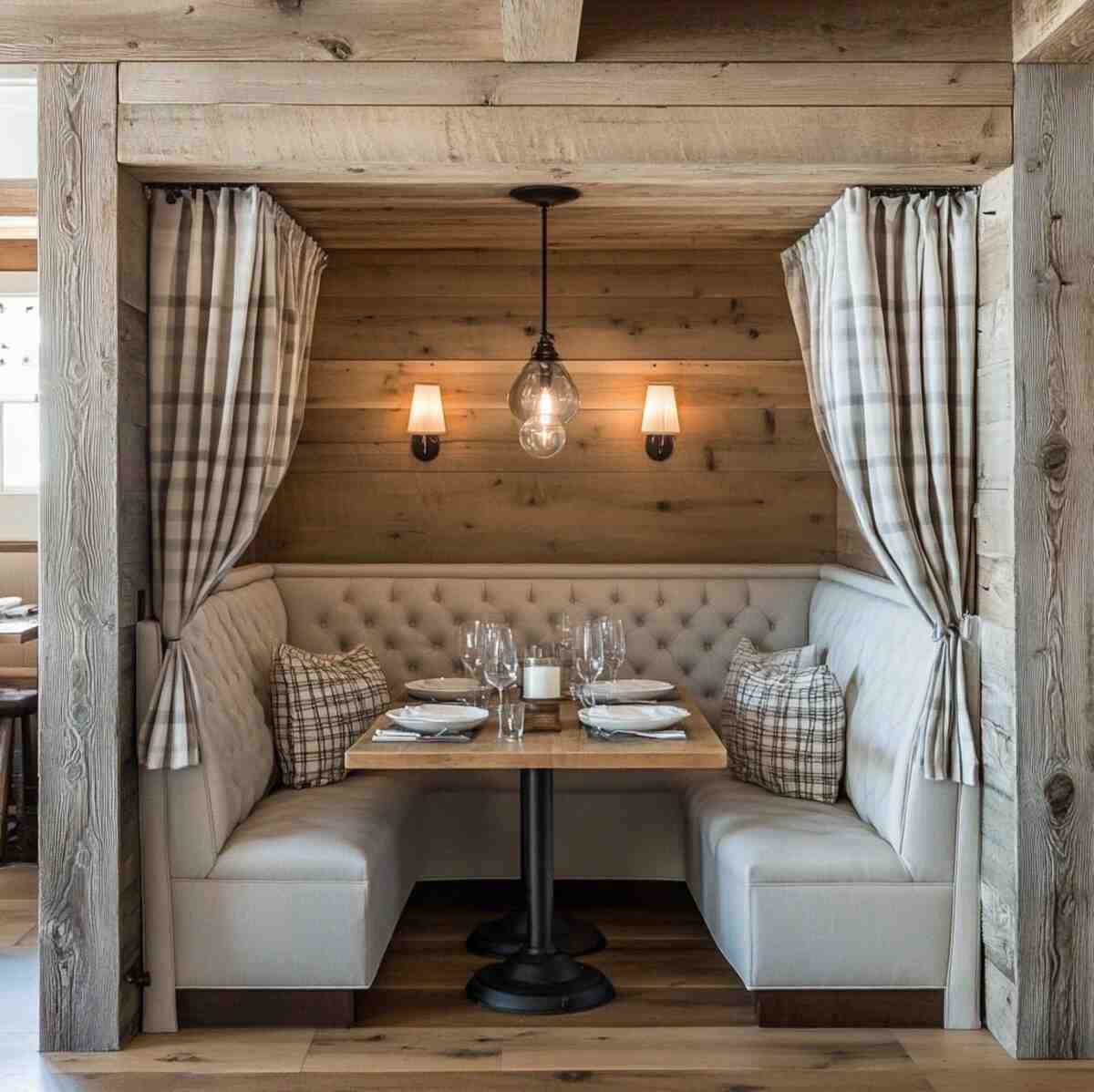 A rustic farmhouse booth adds character and warmth to Cozy Dining Booth Seating Ideas with its natural textures and homey charm.