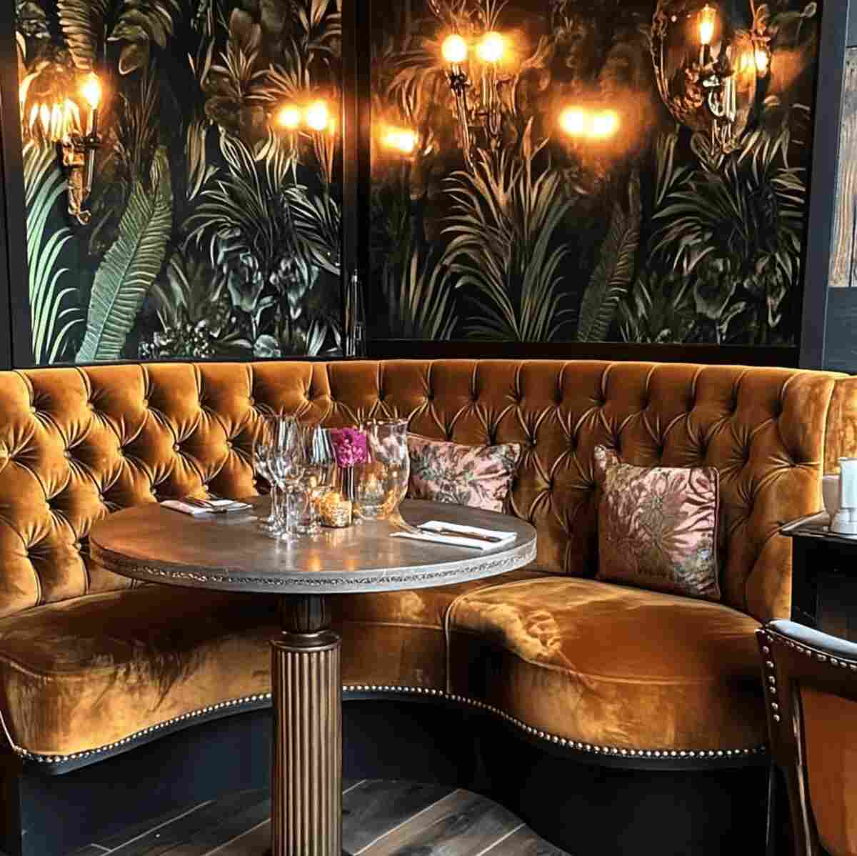 Velvet fabric seating adds a plush and stylish look to Cozy Dining Booth Seating Ideas.