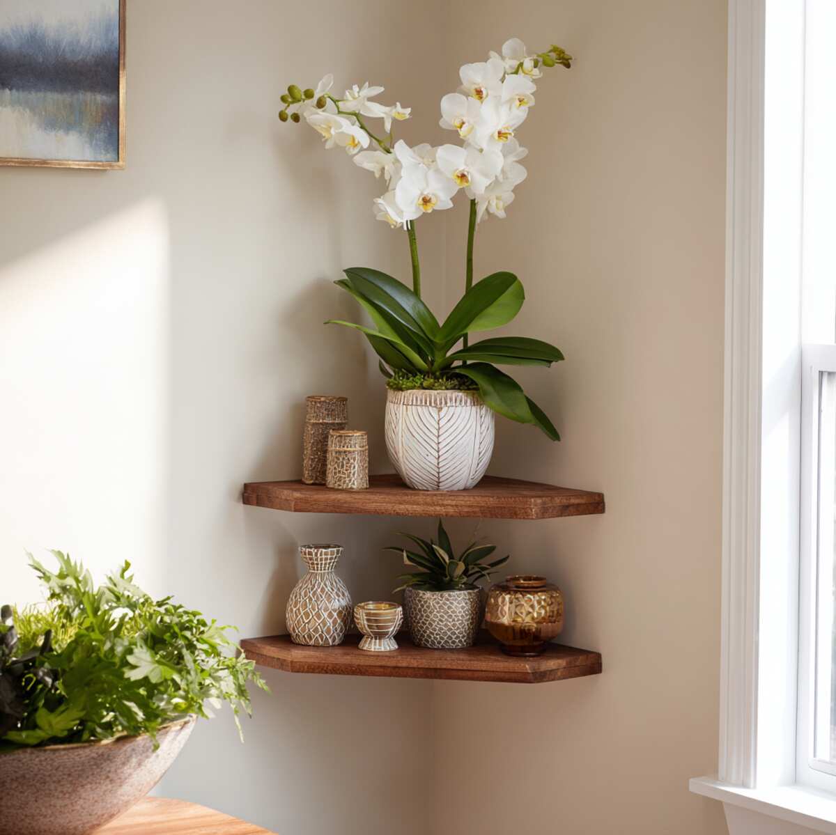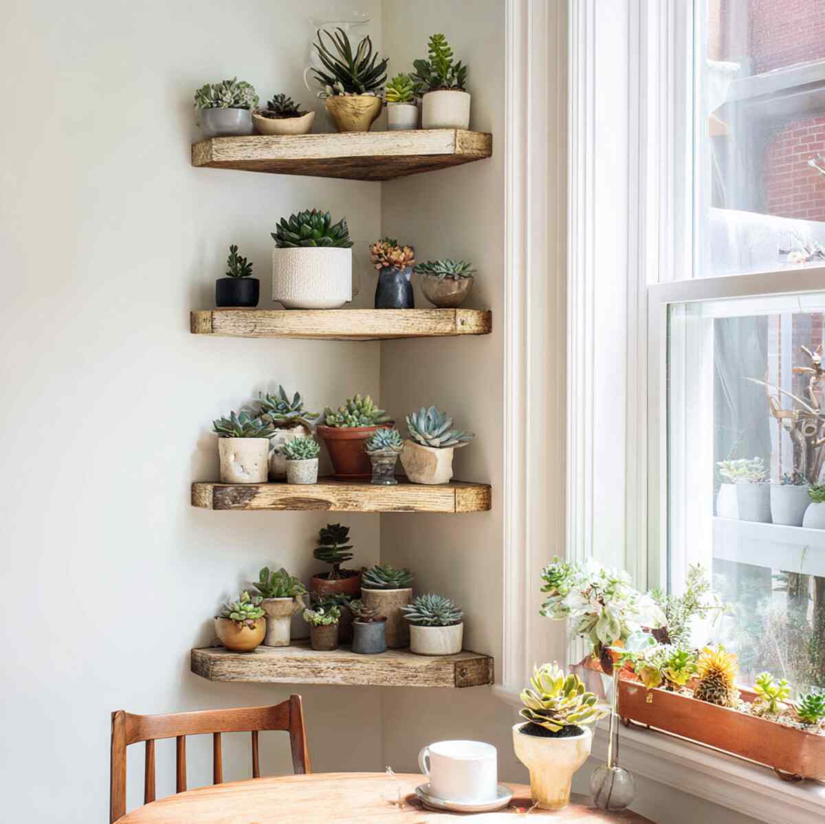 Adding a corner shelf with succulents maximizes space while adding texture and color.