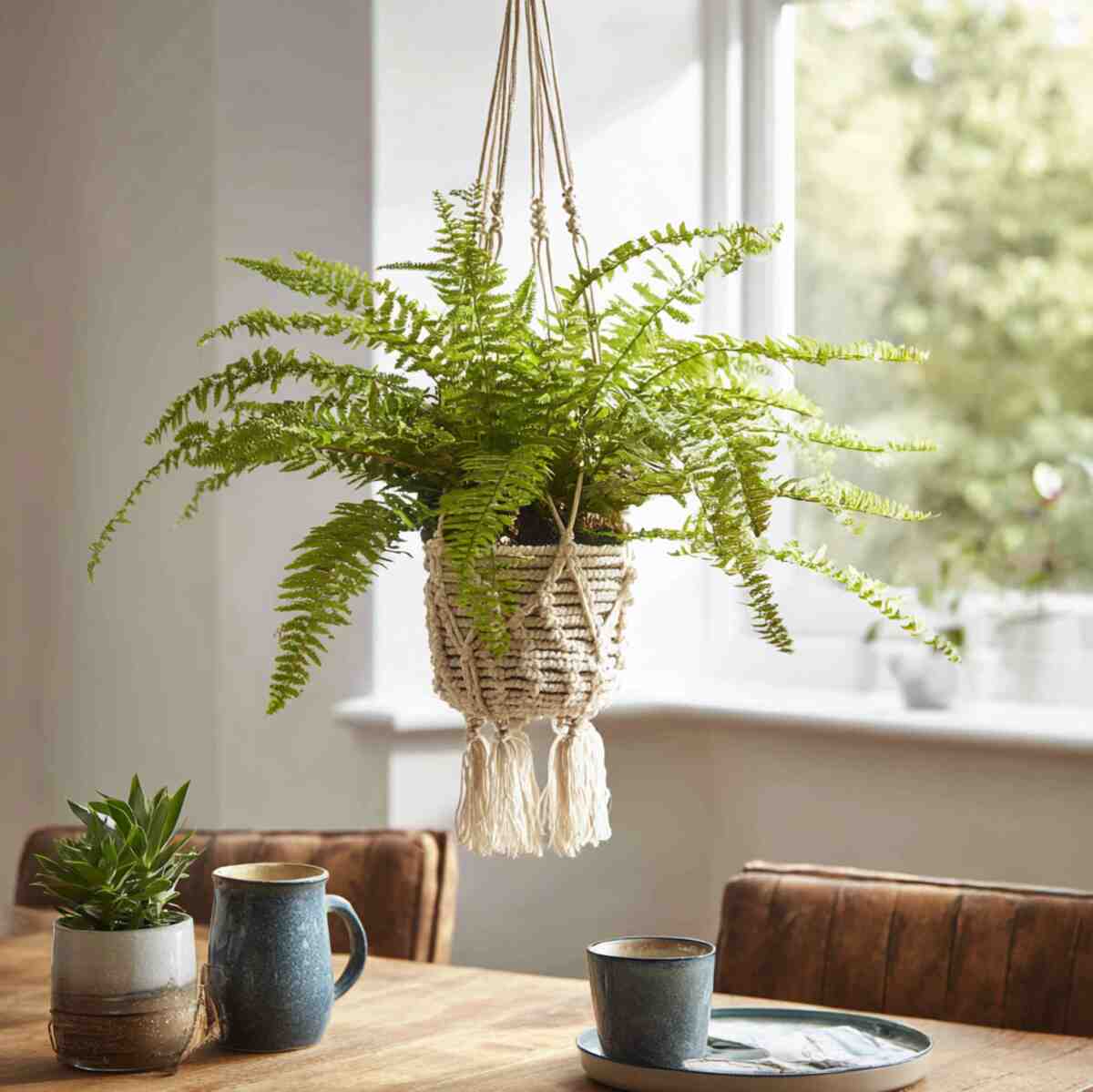 A fern in a macrame hanger brings a touch of nature and artistry to your dining corner.
