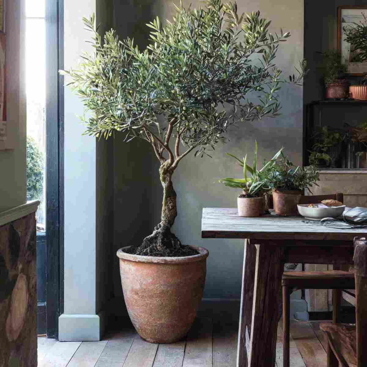 An olive tree adds Mediterranean charm to your dining room, blending natural beauty with sophistication.