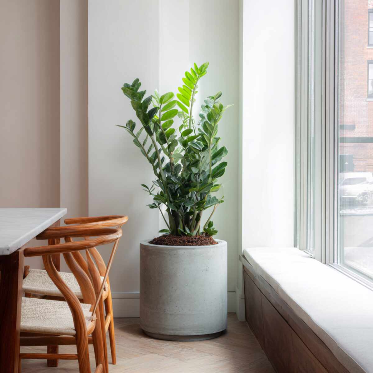 The sleek white planter keeps the design clean, making it perfect for modern dining interiors.