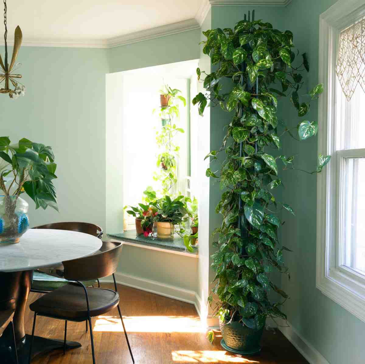 A philodendron on a trellis transforms an empty dining corner into a living wall feature. This is one of the most creative Dining Room Corner Plant Ideas for adding vertical greenery.