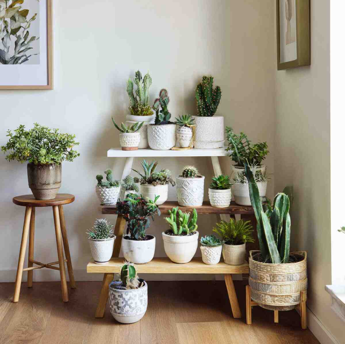 The tiered stand adds height and variety, turning the corner into a mini plant gallery.