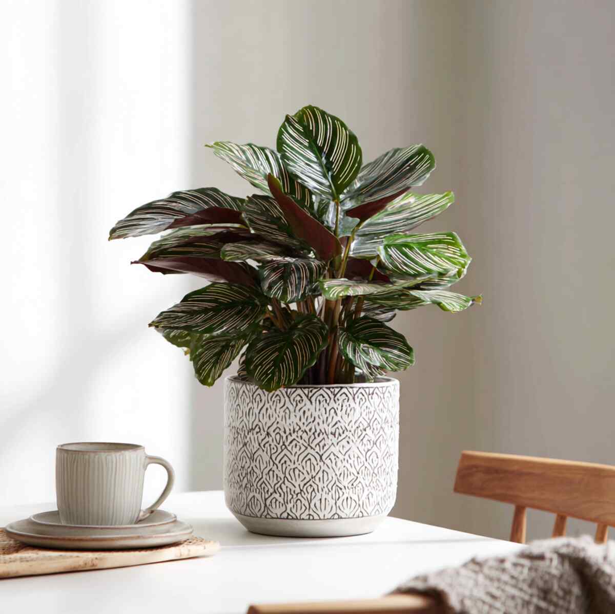 Calathea’s bold leaf patterns add instant color and interest to your dining corner.
