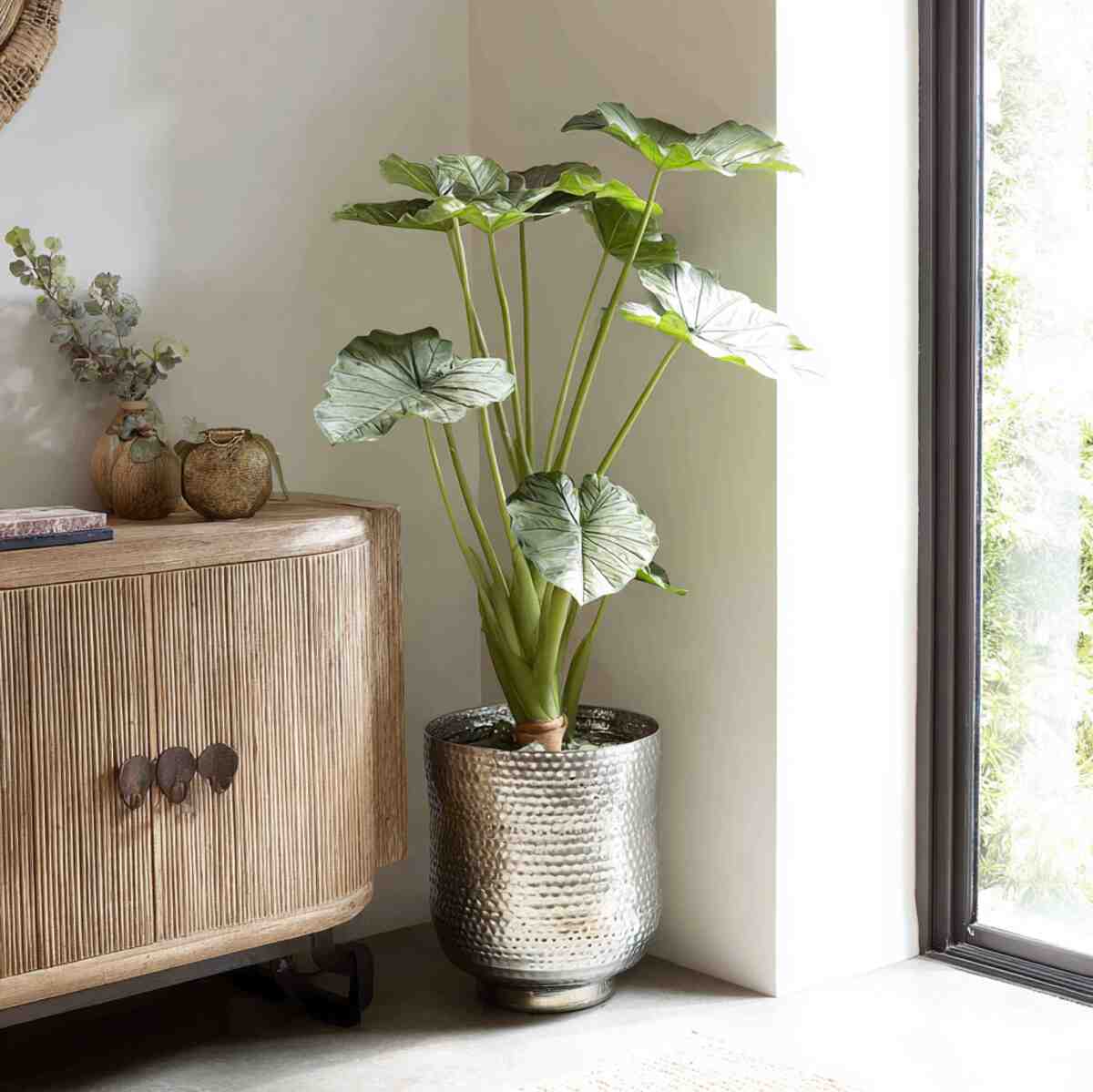 Alocasia, with its dramatic arrow-shaped leaves, makes a strong design statement. This Dining Room Corner Plant Idea suits modern and artistic interiors.