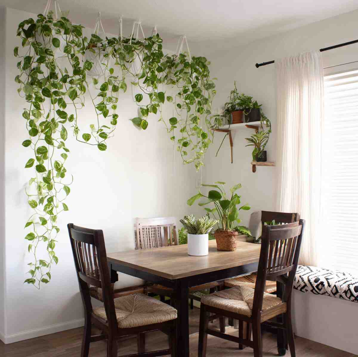 A hanging pothos plant brings a refreshing green cascade to unused corners, adding vertical interest to your dining room.