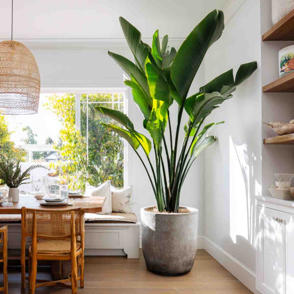 The bird of paradise adds a bold, tropical vibe to your dining space, standing tall with striking leaves.