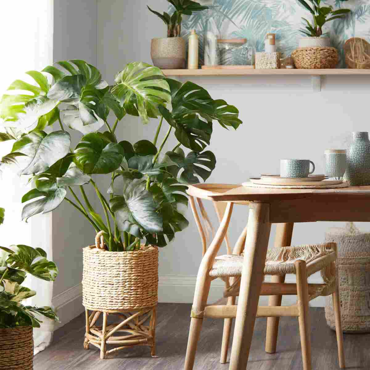 Monstera deliciosa, known for its unique split leaves, brings a trendy jungle charm to dining corners.