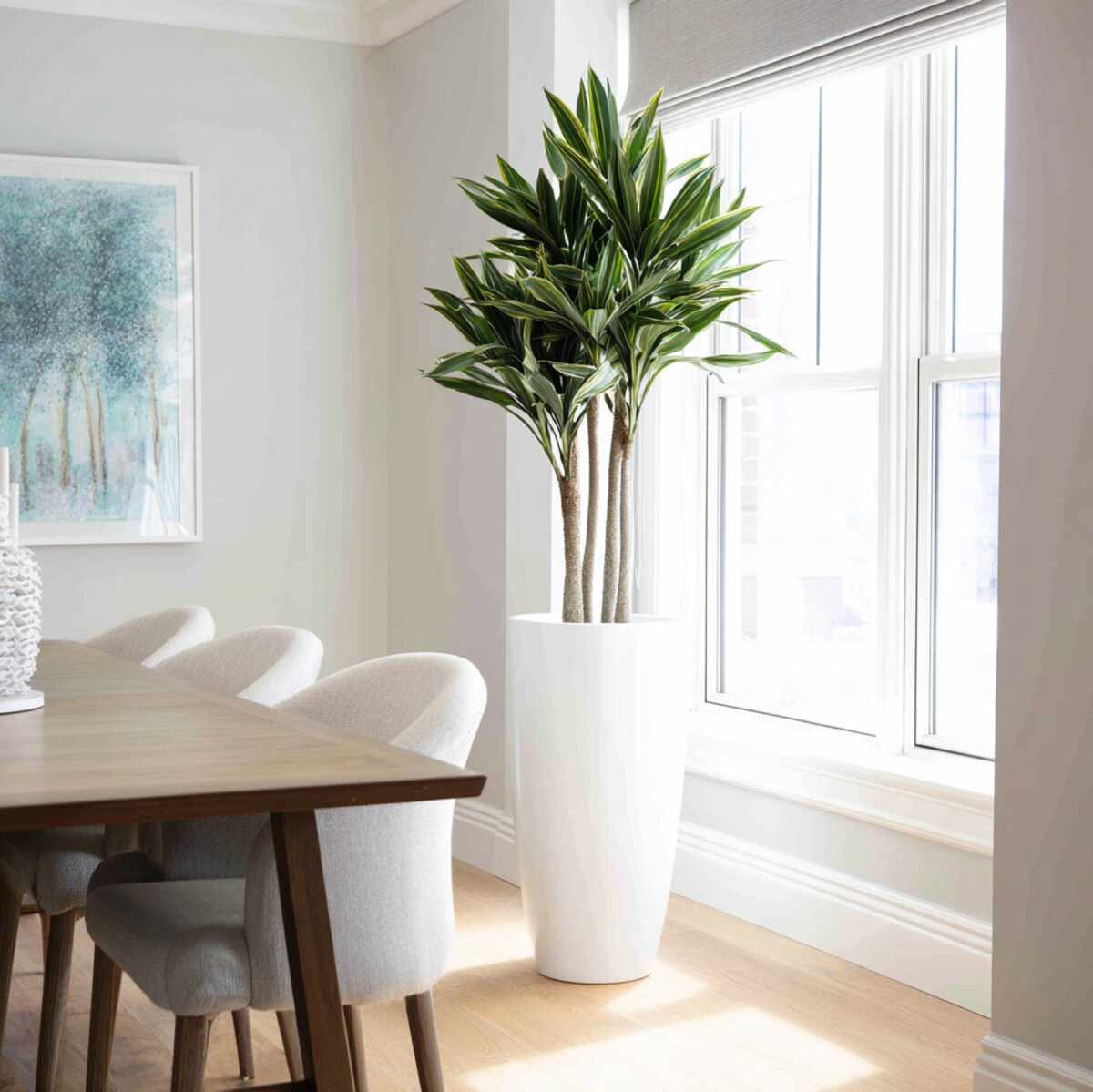 Dracaena is a stylish and low-maintenance choice for dining corners. This Dining Room Corner Plant Idea adds structure with its slender, upright leaves.