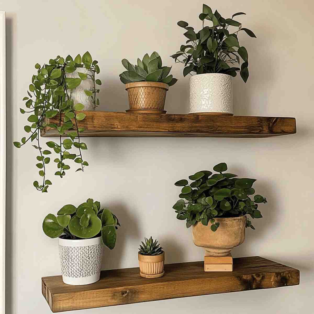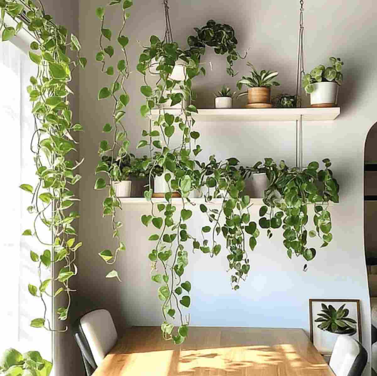Trailing plants create movement and softness, making them an eye-catching part of Dining Room Floating Shelf Decor Ideas.