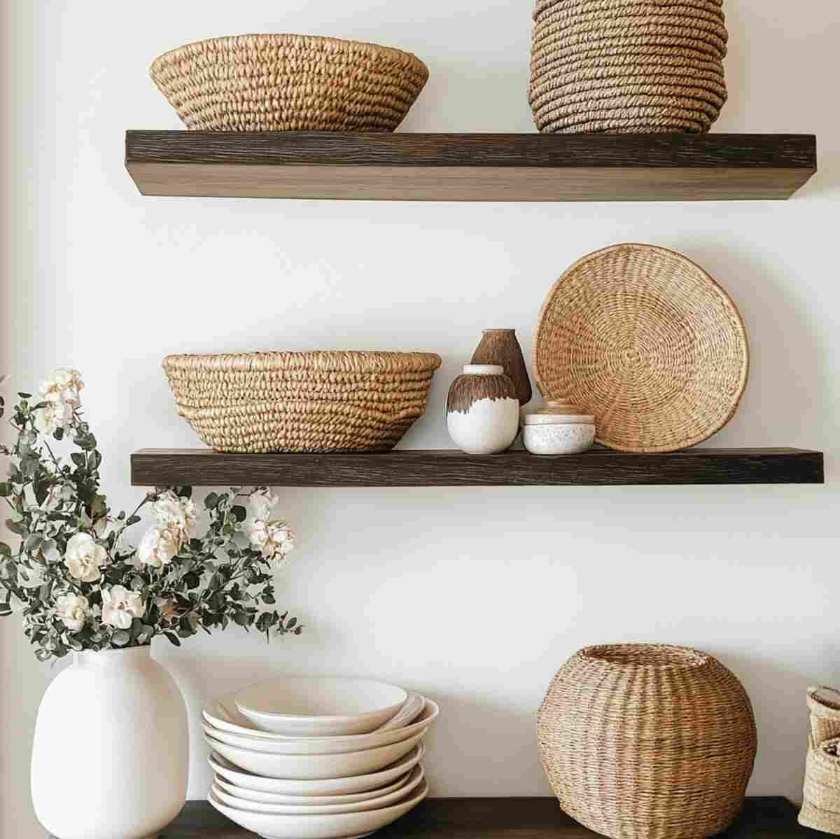 Woven baskets introduce texture and storage, making them a functional part of your Dining Room Floating Shelf Decor Ideas.