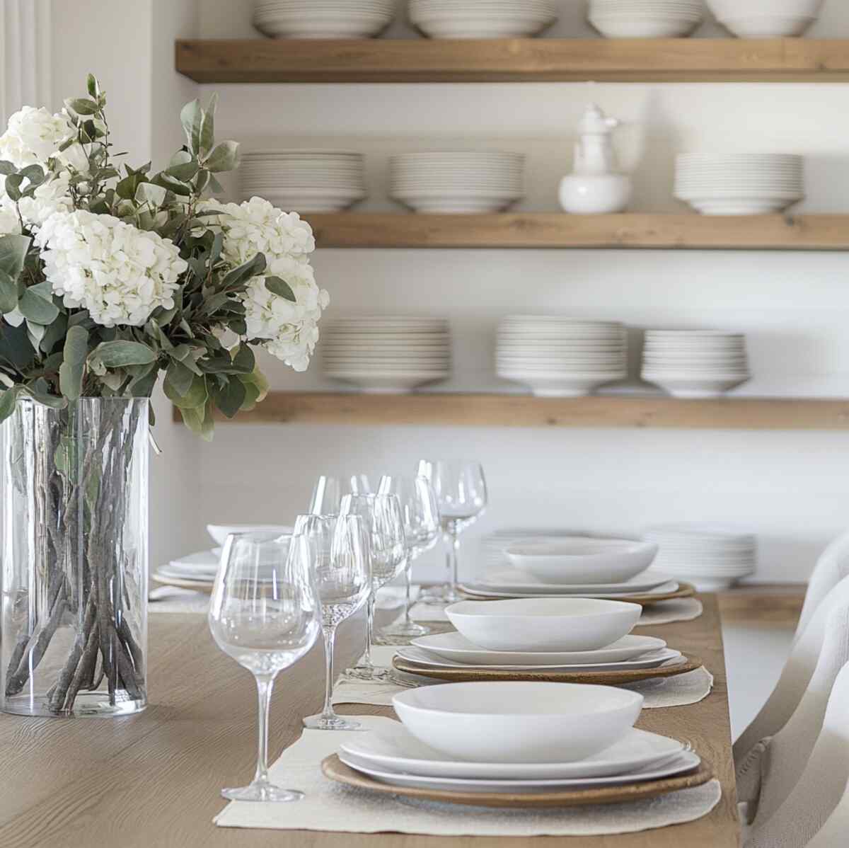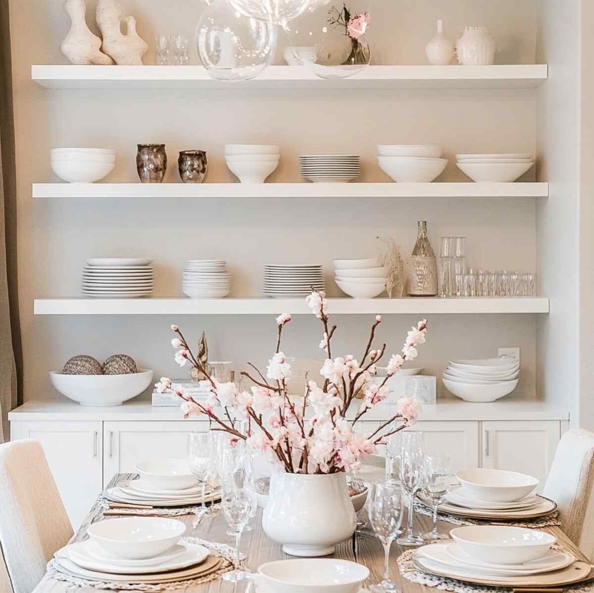 Stacked white dishes are a timeless feature that works incredibly well in Dining Room Floating Shelf Decor Ideas.