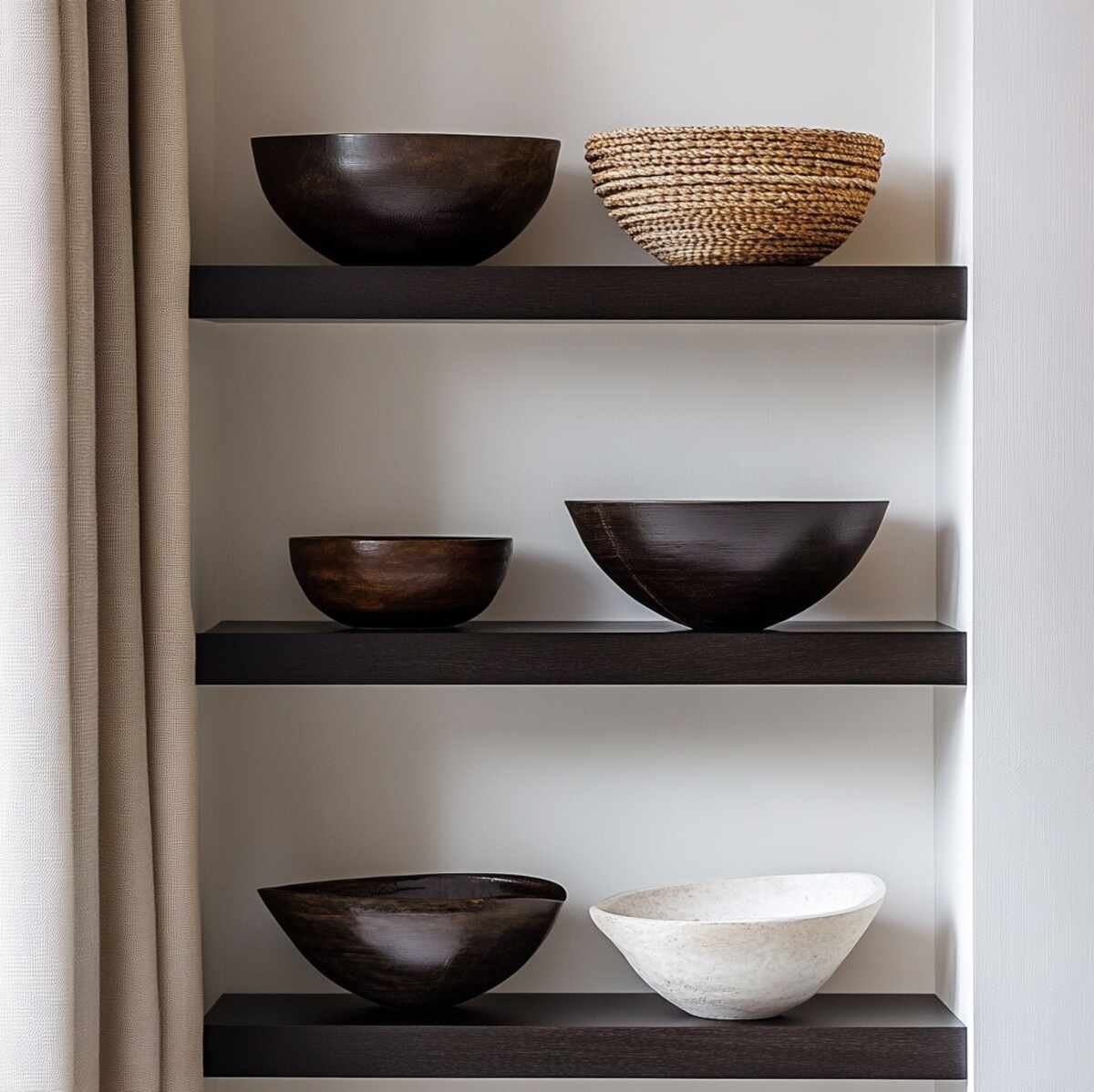 Decorative bowls offer color, pattern, and shape that enhance your Dining Room Floating Shelf Decor Ideas effortlessly.