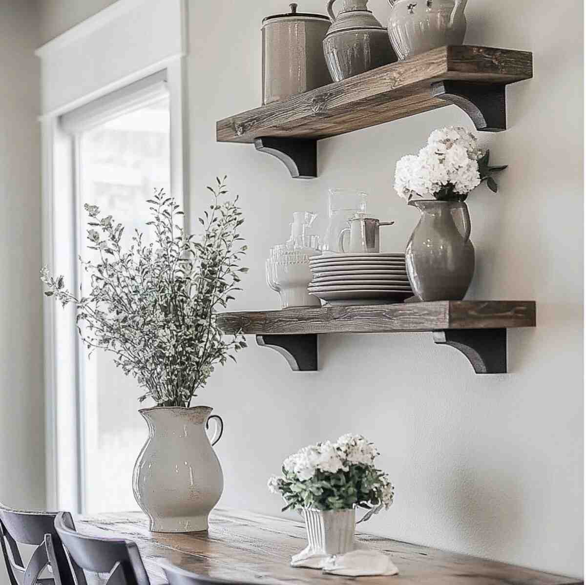 Vintage pitchers add character and charm, making them a lovely highlight among your Dining Room Floating Shelf Decor Ideas.