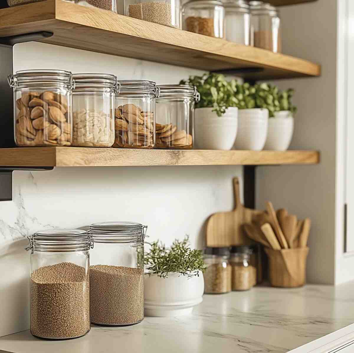 Glass jars are a clean and practical choice for Dining Room Floating Shelf Decor Ideas because they add both beauty and usefulness.