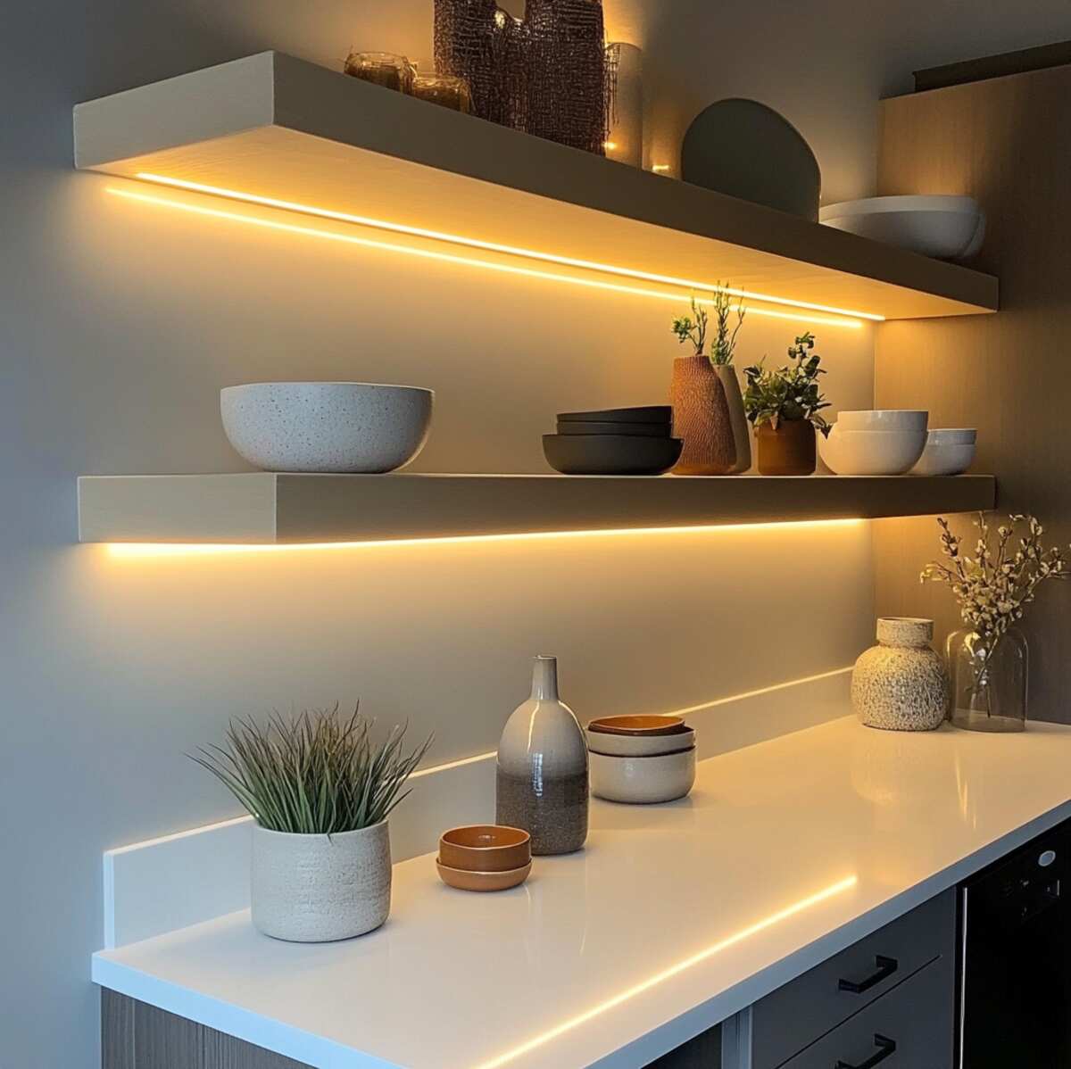 LED light strips enhance your Dining Room Floating Shelf Decor Ideas by highlighting every item on display.