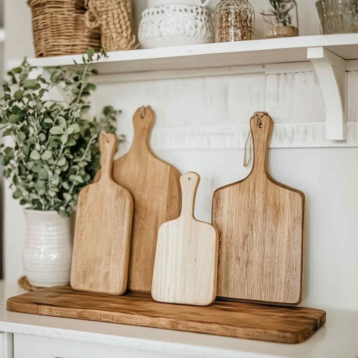 Wooden serving boards add warmth and texture, making them a key element in Dining Room Floating Shelf Decor Ideas.