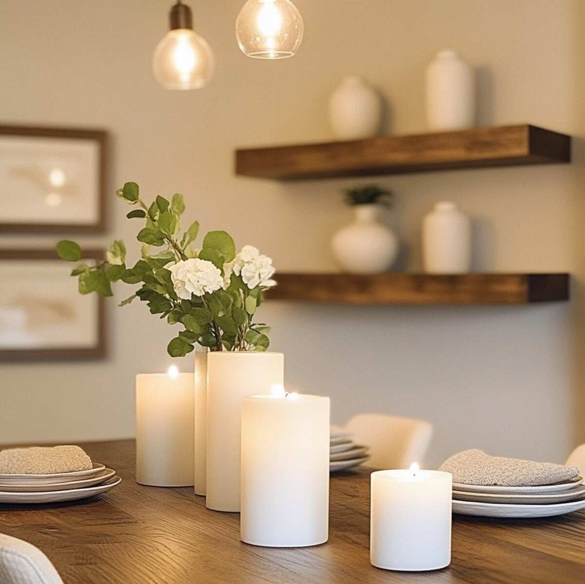 Candle holders bring a soft, cozy glow that enhances your Dining Room Floating Shelf Decor Ideas beautifully.