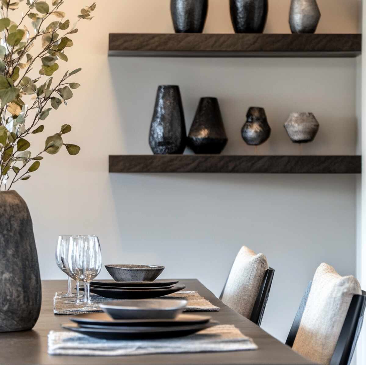 Ceramic vases offer a simple yet stylish touch that elevates your Dining Room Floating Shelf Decor Ideas.