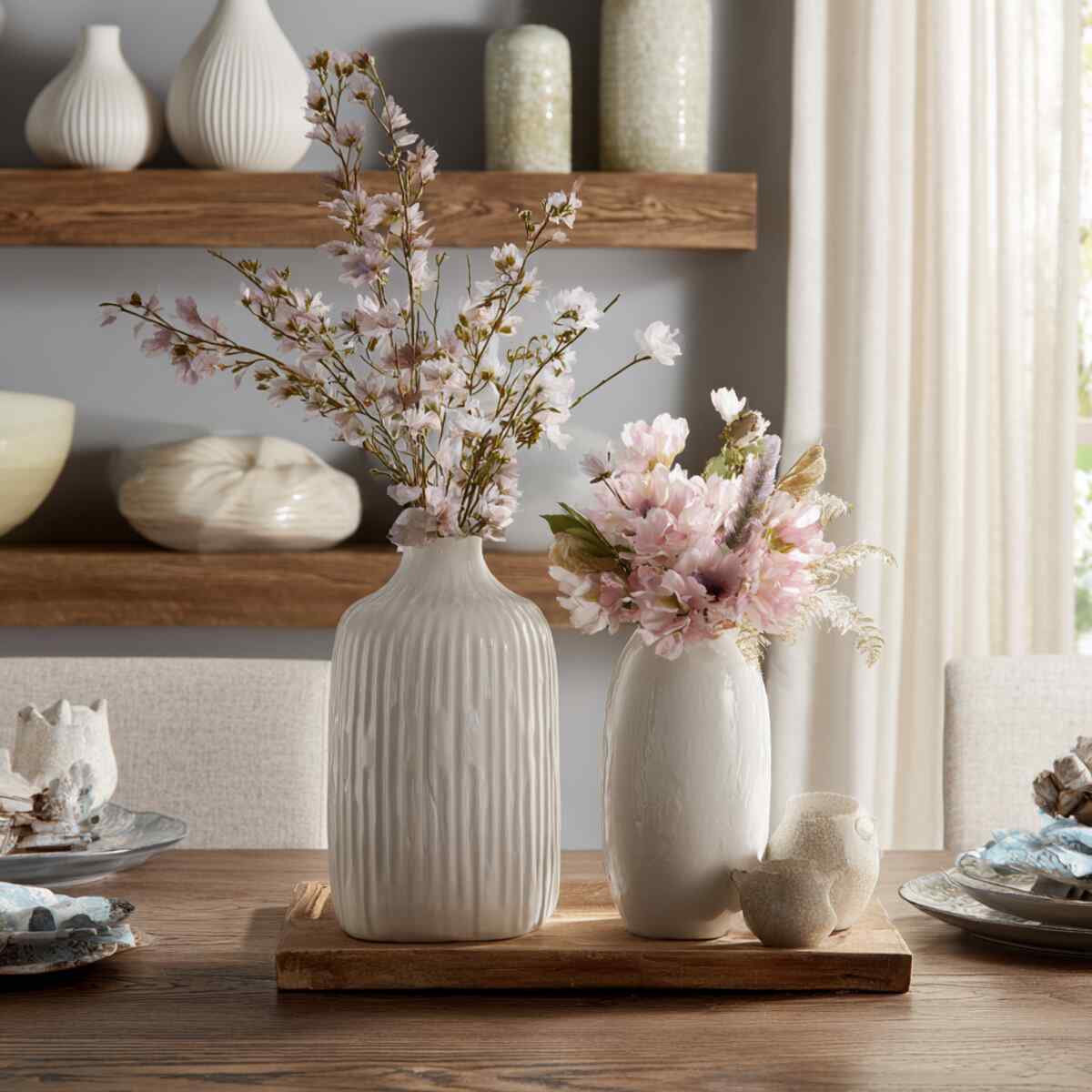 A ceramic vase with fresh or dried flowers is one of the most timeless Dining Table Shelf Centerpiece Ideas because it instantly adds life and softness to the dining area.