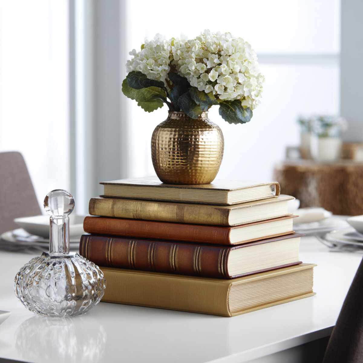 Stacked decorative books are practical yet stylish Dining Table Shelf Centerpiece Ideas that add height and interest to the shelf.
