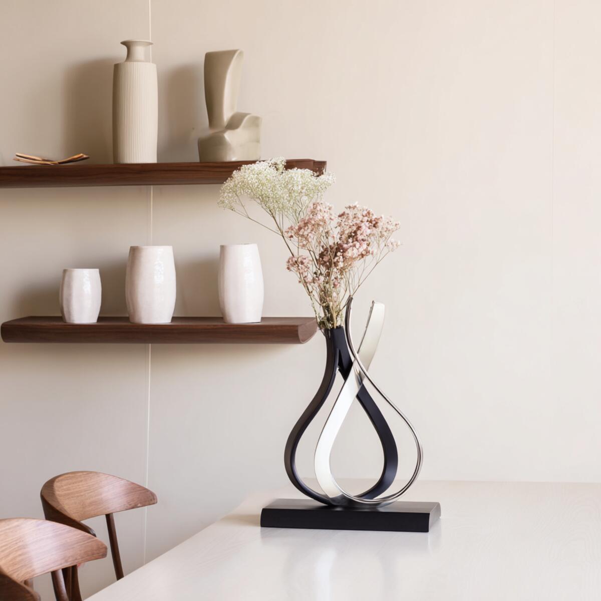 Flowers help balance hard surfaces like wood or glass, making the dining table shelf feel more welcoming and complete.