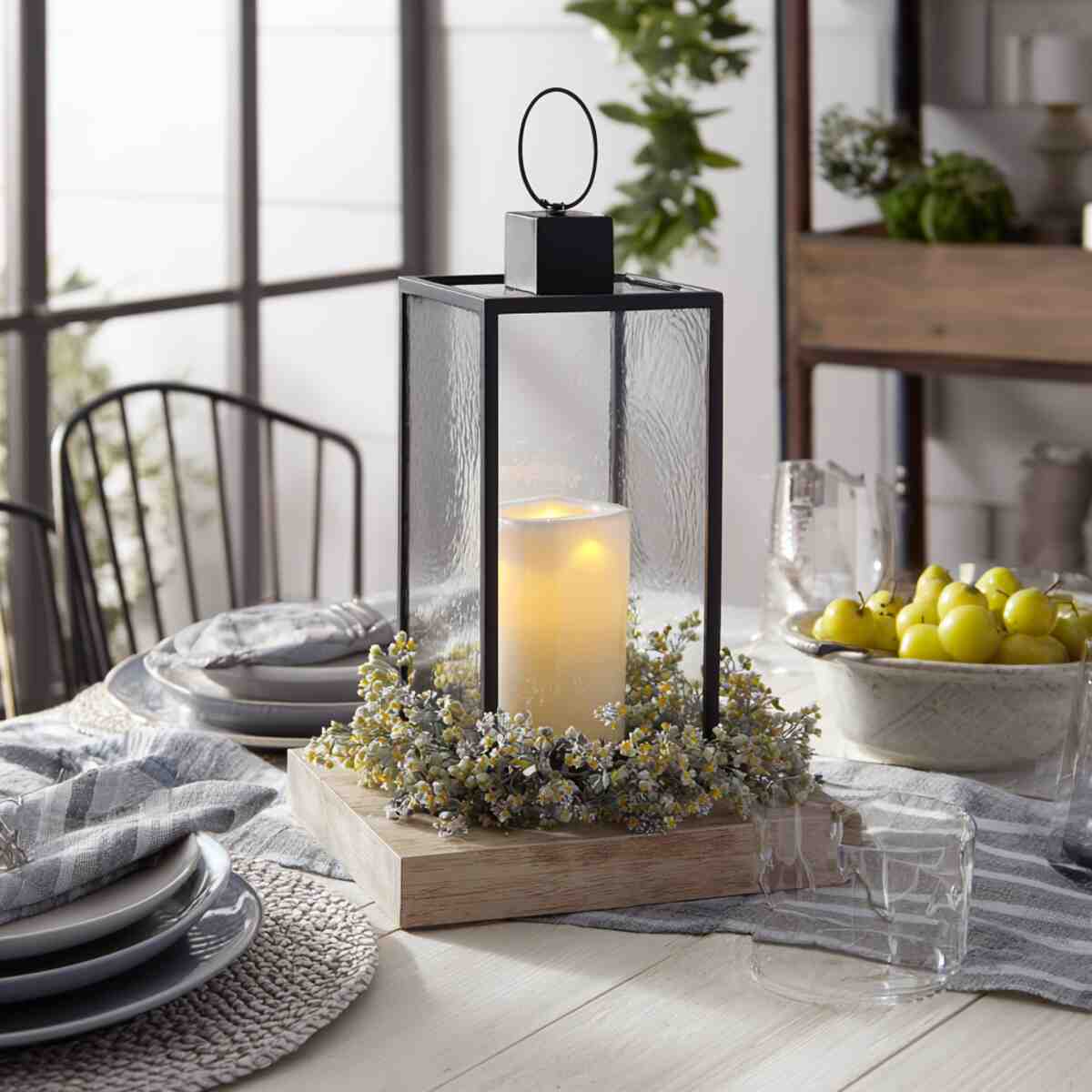 A lantern with an LED candle is a safe and stylish addition to Dining Table Shelf Centerpiece Ideas. It adds a gentle glow that enhances the mood without the worry of open flames near food or guests.