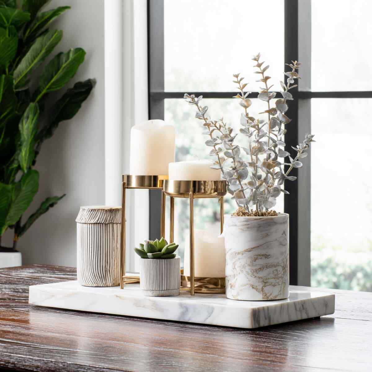 A wooden tray with candles is a warm and structured option that works beautifully as part of Dining Table Shelf Centerpiece Ideas.