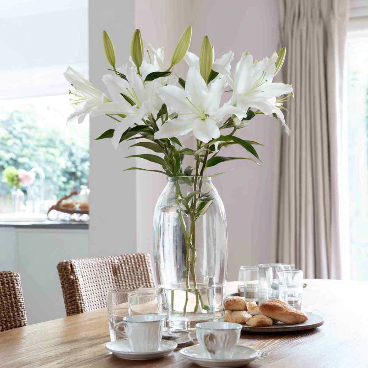 A single tall glass vase with white lilies brings timeless elegance to your dining space. The clear glass keeps the table feeling open and airy while the white blooms add a clean and peaceful touch.