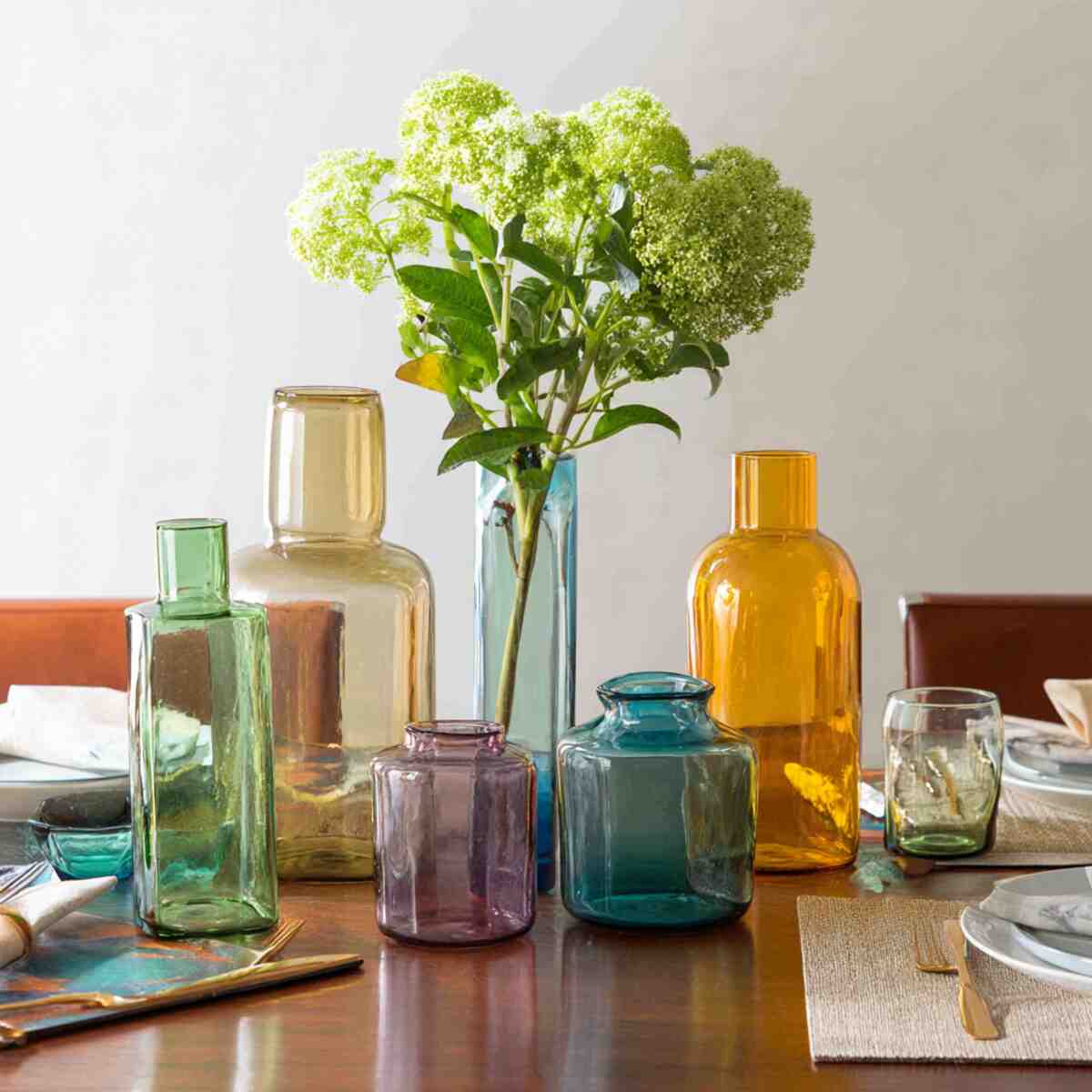 Arranging colored glass vases of varying heights adds visual interest and a playful touch to your table. The mix of colors and levels catches the light beautifully and makes the dining area look lively.
