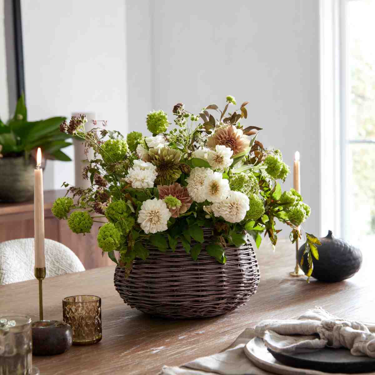 A woven basket-style vase filled with seasonal flowers or greenery brings warmth and texture to your dining setup.