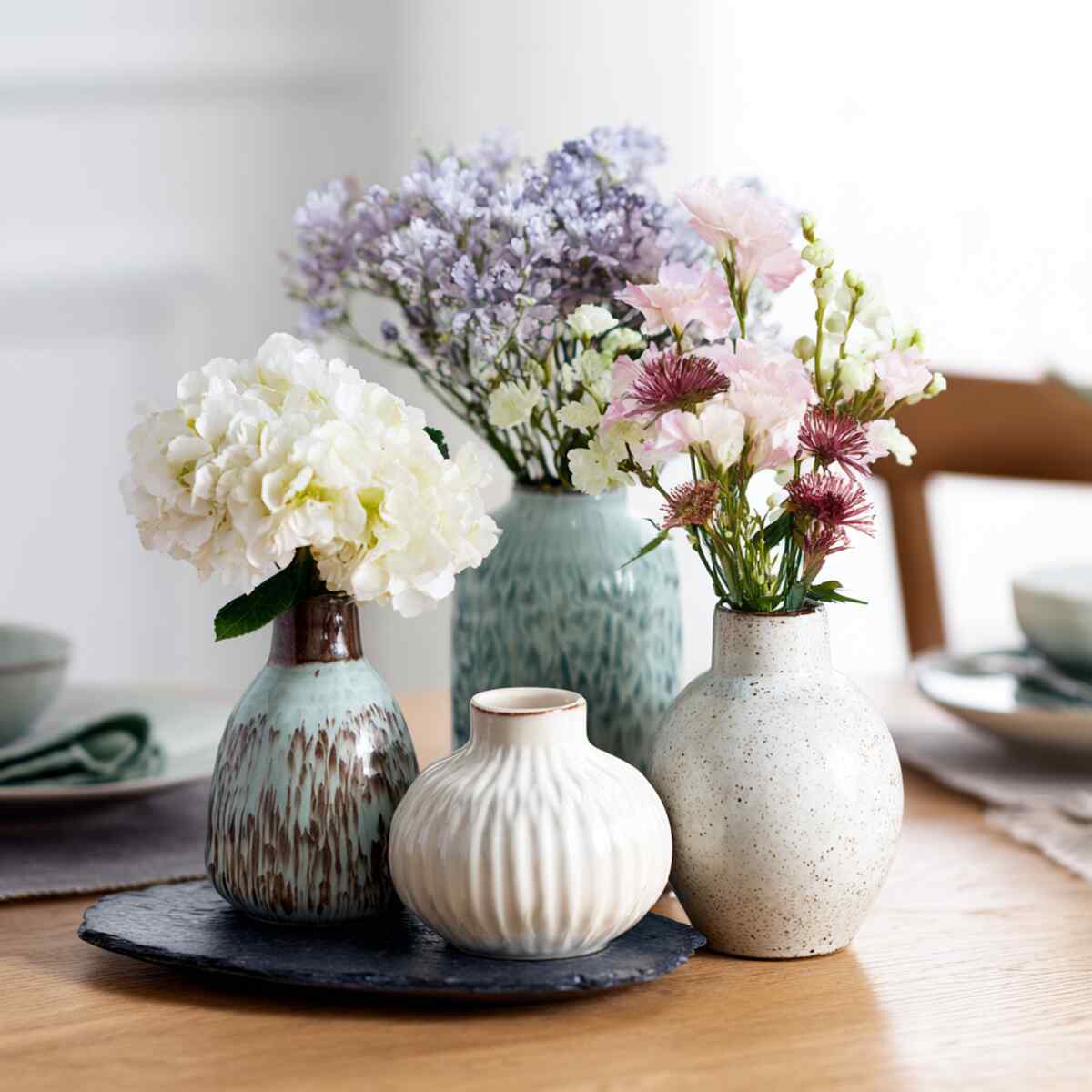 Each vase can hold different types or colors of blooms, creating a dynamic and cheerful look. This Dining Table Vase Styling Idea is great for those who love variety and a casual, lived-in feel.
