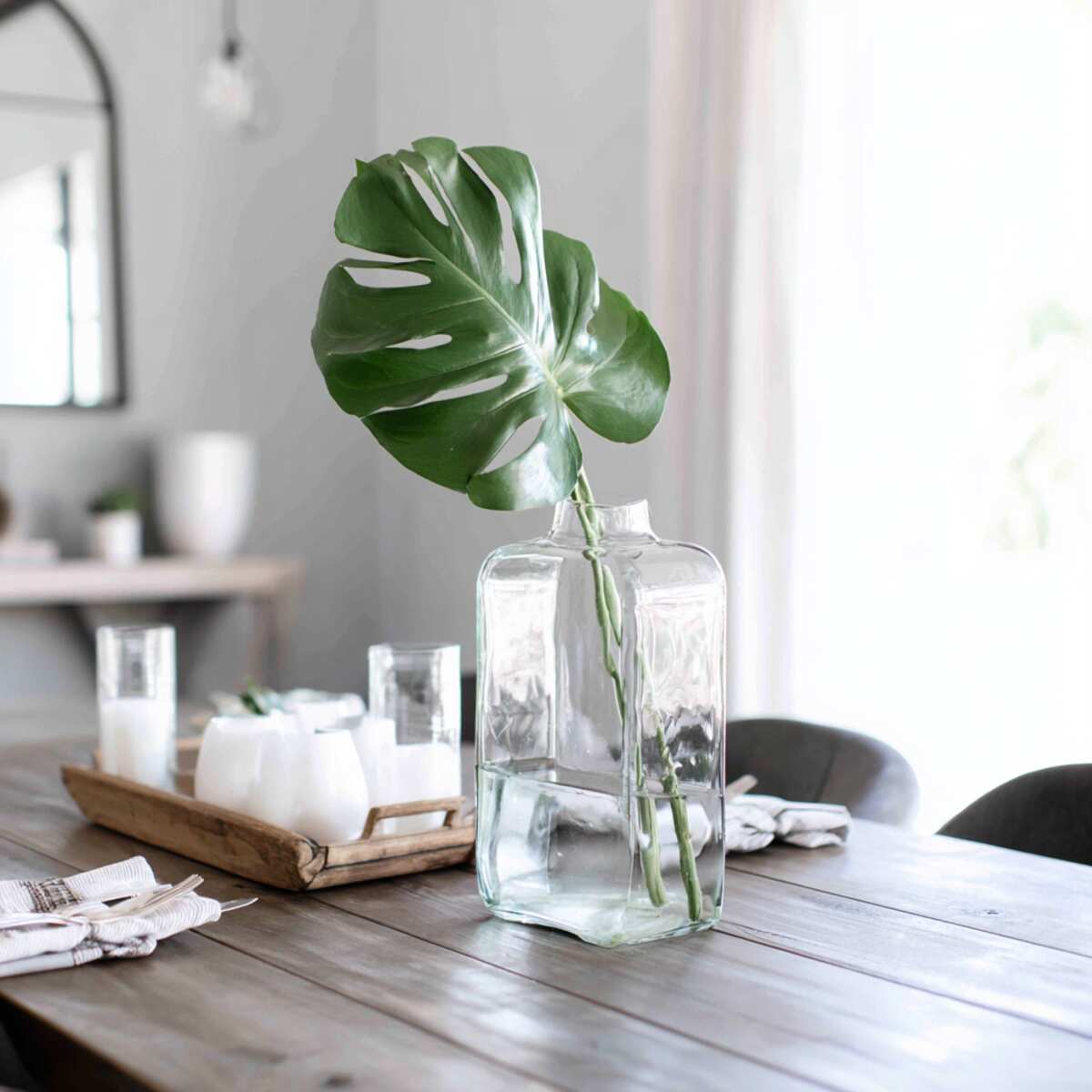 A minimalist clear vase holding just one monstera leaf offers a bold yet simple statement. It adds a modern tropical vibe while keeping your table clutter-free and visually calm.