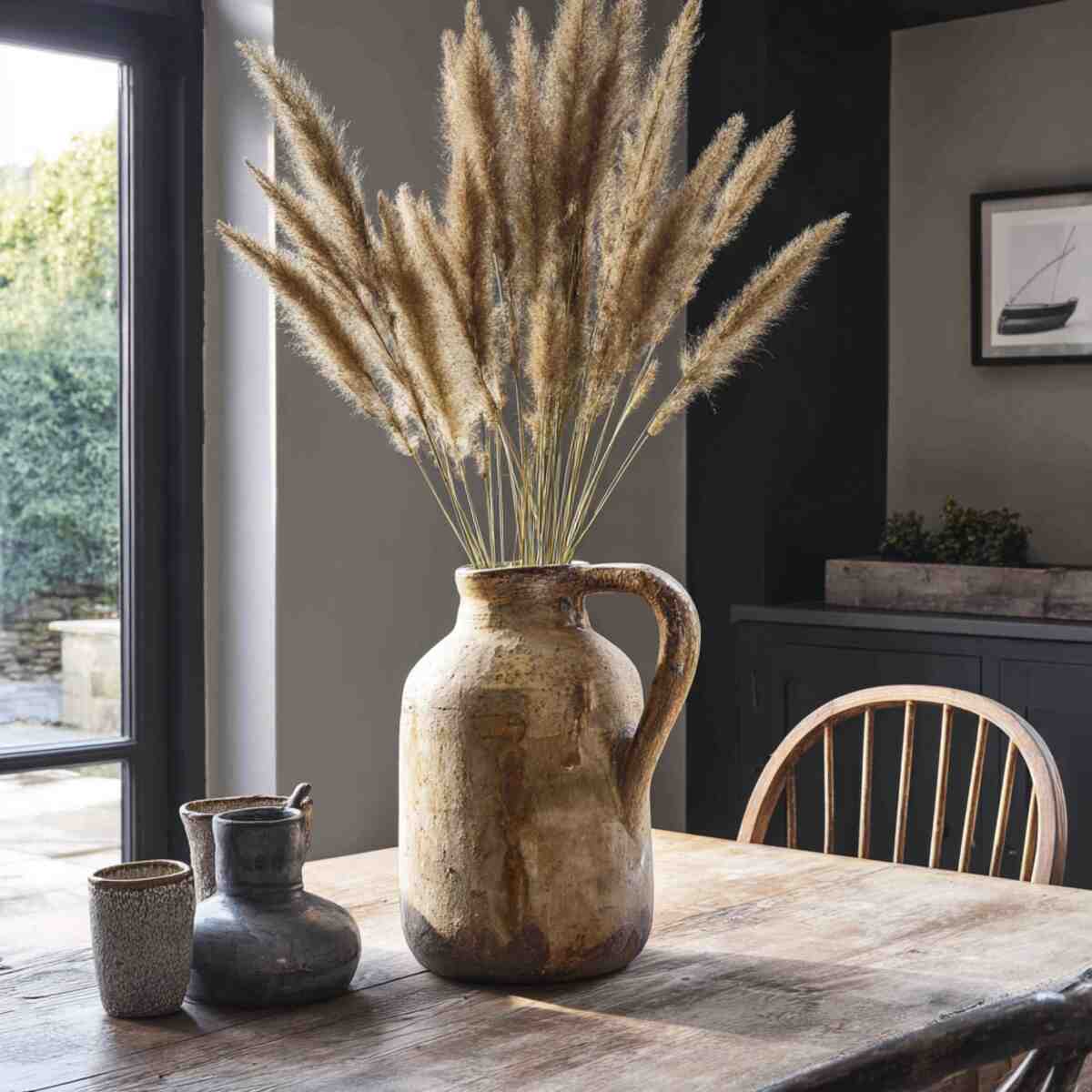 A rustic jug-style vase filled with dried pampas grass gives your dining table a cozy, farmhouse-inspired charm.