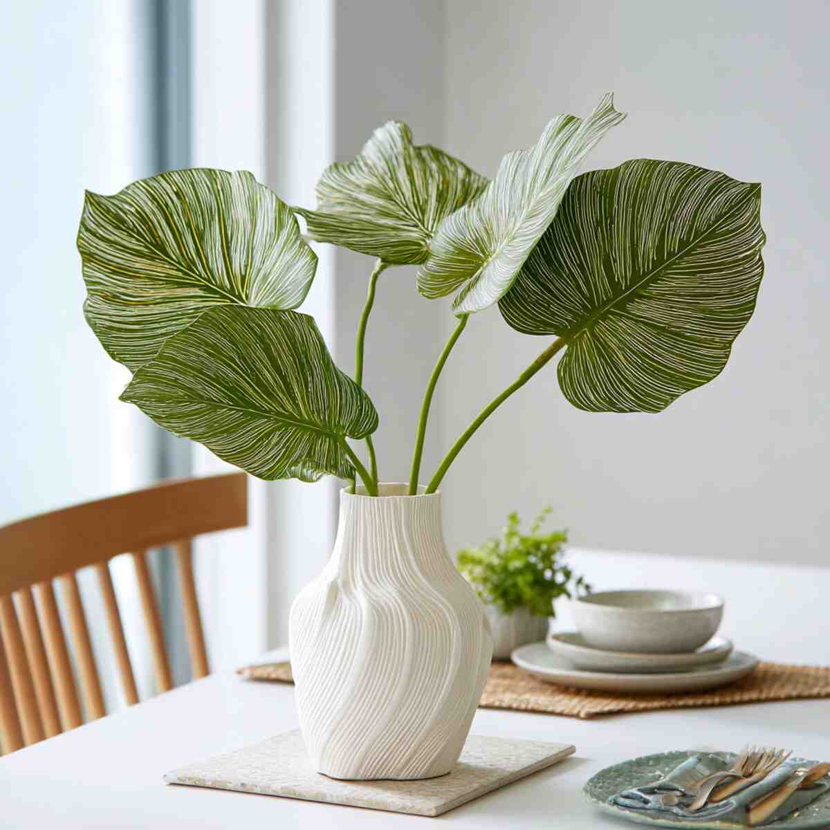 A modern sculptural vase paired with large tropical leaves like banana or palm leaves makes a strong design statement. It brings a hint of the outdoors inside and adds height to the dining setup.
