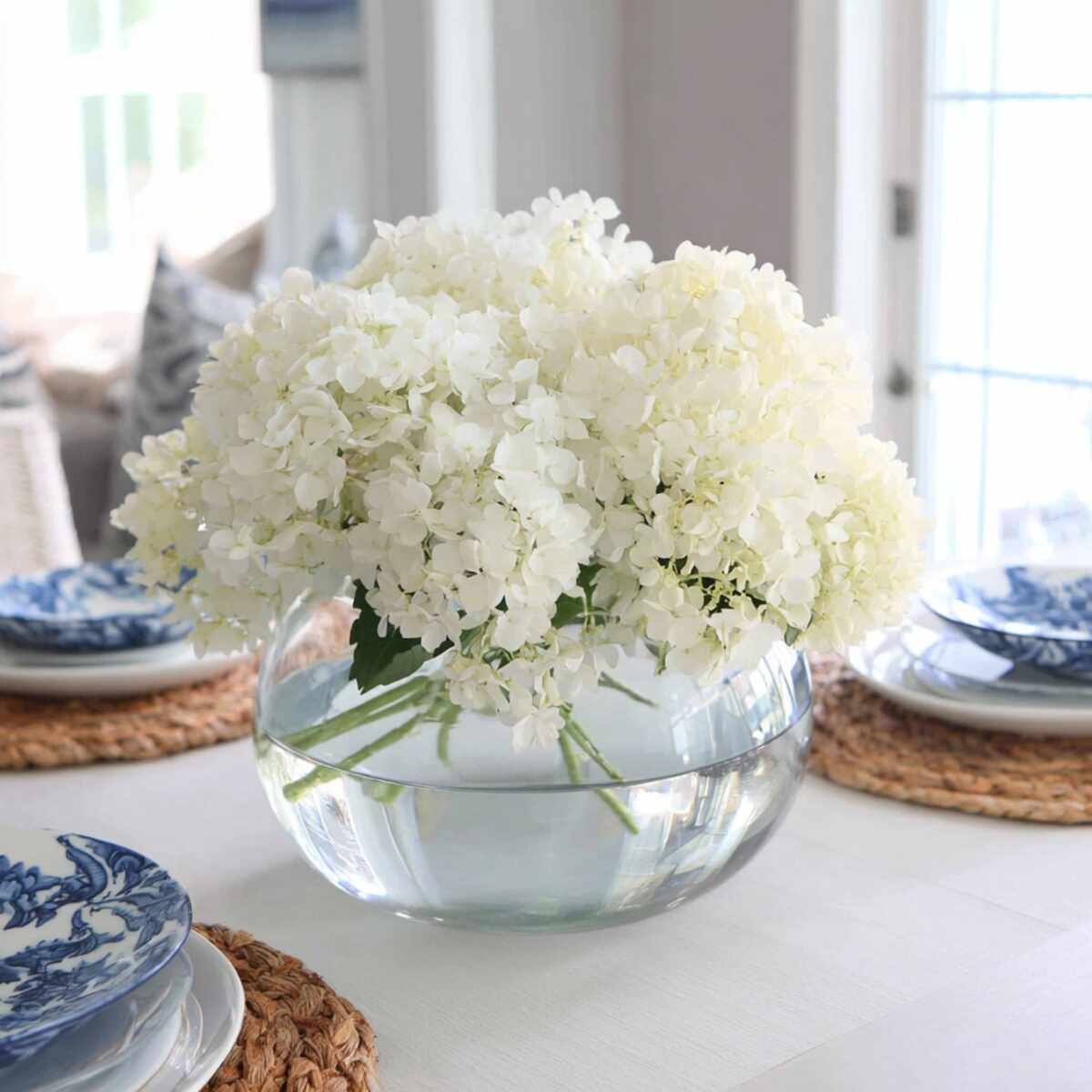 A low, round vase brimming with hydrangeas creates a lush and full centerpiece that doesn’t block conversation across the table.