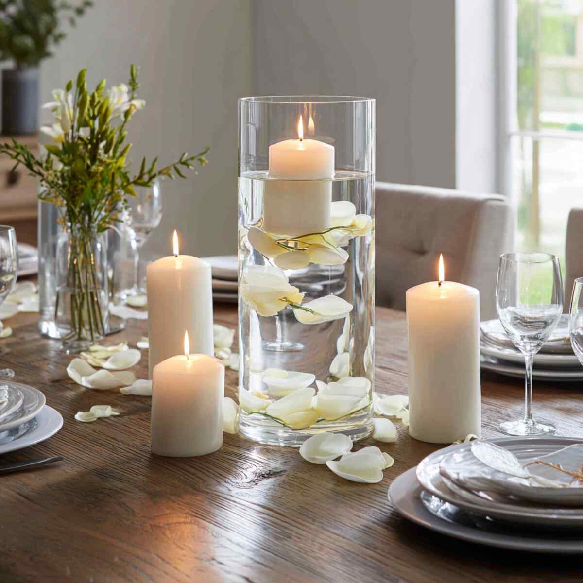 The flickering lights reflect beautifully through the water, adding a magical touch. This Dining Table Vase Styling Idea works wonderfully for evening meals, date nights, or festive occasions.