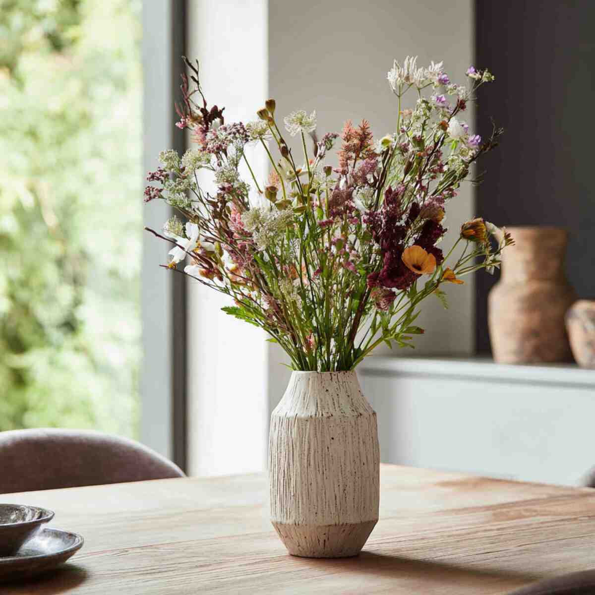 A textured clay vase filled with wildflowers adds an earthy and organic feel to your dining space.